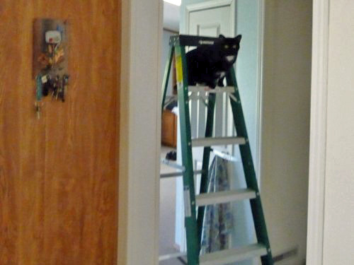 My little helper, aka Midnight, found the ladder sitting under the combination fan and lamp in the family room.  While my attention was on something else, up he went.  Cats will do that, won’t they?  I think we’ve been together long enough that I can tell the thoughts that are racing through that feline mind.