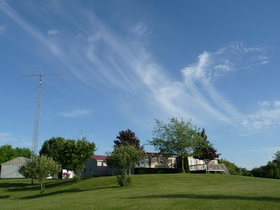 Yes, it was going to be a great day.  Warm weather and a nice breeze.  What a perfect day for working outside.  It is not unusual to see contrails overhead.  We are under a major air-traffic route.  But it was time to get going.  Later, I was engrossed in mowing when I noticed the change in the clouds.