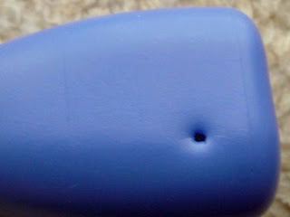 Look! Toward the bottom of the jar somebody made a hole in the treat jar. Could it be a nail? Must be a fang from a ferocious feline that created that crater. I reached down and picked up the jar. The top is thinner, and so the attack centered there.