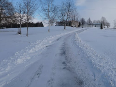 A couple inches of fluffy powder had blanketed the earth last night. The driveway, which I had plowed yesterday, will need attention again today. And our secondary road has only one track open. We’ve had a couple of days of snow, the road hasn’t been cleared and so I was very happy not to meet anyone on the mile to the paved road.