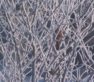 Diamonds of rime encrust the branches of the crab apple trees reflecting and refracting the rays of the early sun and adding glints of luster to the scene. Sparkling diamonds everywhere.