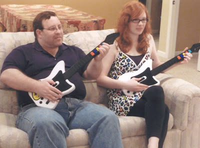 We went inside and after an excellent dessert, I asked Briana if she would show me how Guitar Hero works. She said, “Sure!” (I love that girl.) Everybody adjourned to the family room in the basement. Briana and Bryant had the large screen, game machine and the controllers hooked up in no time. And before you can say, “Well, dog my cats” the feud had begun. It was duelling guitars.