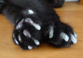 I think you have been completely captured by a black kitty. His tail must have had one rough life before he found you! Never heard of those nail covers. Hope they work out, 'cause it seems like a great solution.