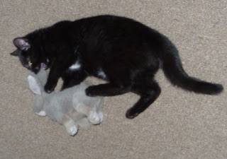 Midnight’s Auntie Lin suggested that we get him a toy about his size with the same number of appendages. (Hobbes has a party pig.) Midnight has a rascally rabbit, or it a Wascally Wabbit?