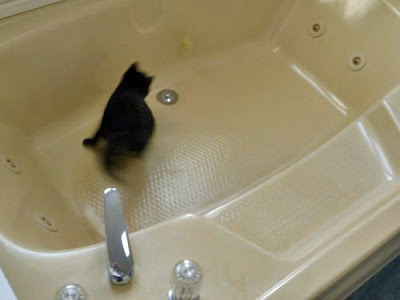He was such a cute little fur ball back then. Today, he’s much bigger. My sister Clara and blogger bud, Lin, had good ideas to share about caring for seven to eight-month-old Midnight. One of the suggestions was to put him in the bath tub with a ping ball to bat around.