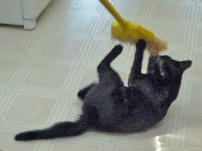 Midnight loves to help Sylvia do all kinds of things.  One of his favorite activities is sweeping the kitchen floor.  Last week she said to me, “Get your camera and see how he loves to help me.”  Let me show you what I saw.
